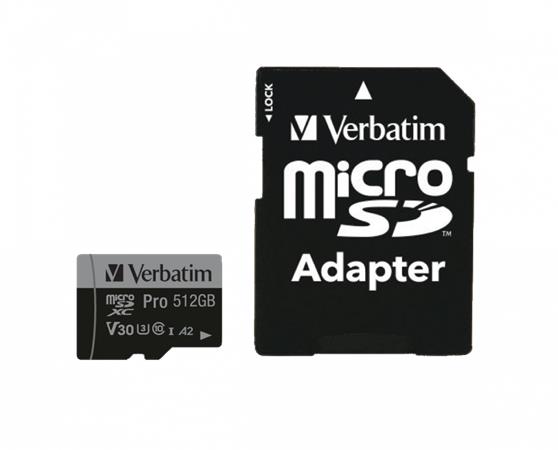 Memóriakártya, microSDXC, 512GB, CL10/U3/A2, 100/90 MB/s, adapter, VERBATIM "PRO"